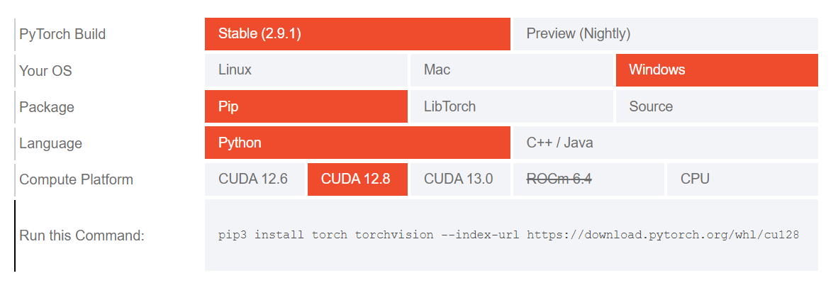 在官网选择自己的要求,可以生成pip的安装指令