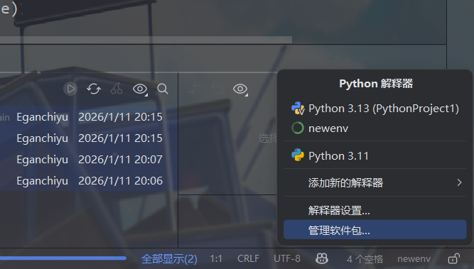 在右下角打开配置环境窗口(就是我这个newenv的位置),选择添加新的解释器-添加本地解释器-选择现有-类型Conda